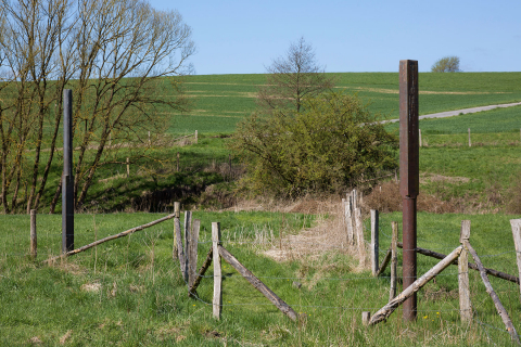 Die zweiteilige Skulptur „Beziehungen gegen Bedingungen“ von Ansgar Nierhoff fügt sich in die Niederung des weitläufigen und nur auf Hügelhöhe ansteigenden Geländes des Hasselbacher/Werkhausener Tals. Die beiden Eisenstelen erheben nicht den Anspruch, von weither sichtbare Landmarken zu sein. Die örtliche Situation kann von dem umherwandernden Besucher erst allmählich visuell und räumlich erschlossen werden. Verdichten sich in der Senke die Linien der mit Holzpflöcken umgrenzten Wiesen noch zu einem aus der Ferne kaum entwirrbaren Grenzdurcheinander, so klären sich die Verhältnisse bei näherem Hinsehen: Die Wiesen stoßen hier im Talgrund als arithmetisch unregelmäßige Flächen aneinander. Für den Ort der Skulptur ergibt sich die besondere Situation eines spitzwinklig auslaufenden Feldendes, das sich wie ein Keil zwischen zwei weitere Grundstücke schiebt. Zum Zeitpunkt des Entwurfs der Plastik war dieses Zipfelchen Erde noch nicht in das Territorium ›im Tal‹ eingegliedert, es stellte de facto ›fremdes Gebiet‹“ dar. Dieser äußere Anlaß lieferte dem Bildhauer eine der Bedingungen für seine Arbeit: Zwei massive Eisenelemente sind in den Winkeln der jeweils benachbarten Felder so aufgestellt, daß sich zwischen zwei Polen eine imaginäre Achse über das nicht zugehörige Areal bildet. Die Beziehung (Achse), überbrückt die vorgegebene Bedingung (Parzellenform).