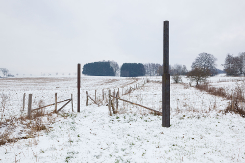 Wie vom Künstler schon sehr früh geäußert, geht es ihm in seinen Arbeiten um »Beziehungen zwischen Bezeichnungen und dem (Bedeutungs-) Umraum«4. Ansgar Nierhoff erschafft durch seine Setzungen (die beiden Eisenstreckungen) einen Ort in der Landschaft und macht diese erfahrbar. Dabei geht er sehr vorsichtig vor: »Man kann/darf nicht gegen Landschaft angehen.«5 Geschärft im Sehen und in der Wahrnehmung betrachtet der Mensch nicht nur den Ort der Skulptur; in der Talsenke stehend wird das bezeichnete Gebiet zum erfahrbaren Mittelpunkt, der geradezu einlädt, rundum in die Landschaft zu spähen. Vollkommen neue Landschaftserlebnisse bieten sich dem Blick an: Die Sicht nach Süden orientiert sich an den beiden Stelen, ferne Bergrücken umfangen die künstliche Form. Eine weiter weg liegende, bewaldete Kuppe wird optisch als korrespondierende Fläche zur Eisenstreckung gelesen; es ergibt sich ein Spiel von flächig wahrgenommenen Hügelformen, die Landschaft schrumpft auf Papiertheaterräumlichkeit. Mit jedem Schritt des Betrachters ändert sich die Szenerie. Eine der Eisensetzungen stößt gar aus der Kontur der Landschaft hinaus, das obere, runde Eisenstück scheint sich himmelwärts zu schrauben, während das Pendant der anderen Stele von der Last des oberen Pfeilerstücks in den Boden gerammt scheint. Man meint, Bewegung zu verspüren – und weiß doch: beide Streckungen gleichen sich in Maß, Proportion und statischer Aufstellung.