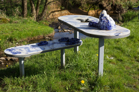 Ovale Tische und einige Hocker stehen in der Landschaft beieinander, zwei haben sich auf die kleine Insel verirrt. Hinsetzen freilich kann man sich nicht, denn belegt sind die freundlichen Möbel mit Keramikfliesen. Jeder Tisch, jeder Hocker, der in der Landschaft steht, ist anders bemalt, meistens sind sie auch beschrieben. Die Keramikplatten schimmern weiß und blau, Linien und Kleckse, Punkte, Flecken, Markierungen. Schrift und Bilder wie seltsame Landkarten, mehrere Berge und zwischendurch Löcher mit demselben Grundriss wie die Erhebungen, festgeklebte Teller. Ein angeschnittenes tönernes Brot liegt auf Tisch und Stuhl, seine Oberfläche ist rauh und glatt zugleich: »Wie alles anfing.« Auch die anderen Objekte, die auf den Tischen und Podesten herumliegen, die kleinen und größeren Berge, Haufen, Klumpen sehen aus als wären sie eßbar. Weiß grundiert und blau geädert, die Farbe scheint ihren eigenen Gesetzen zu gehorchen. Eine dicke Glasur hüllt sie ein und rundet jede Kante, die anthropomorphen Haufen glänzen verlockend und es scheint fast als würde eine schwere süße Sauce langsam an ihnen herablaufen.