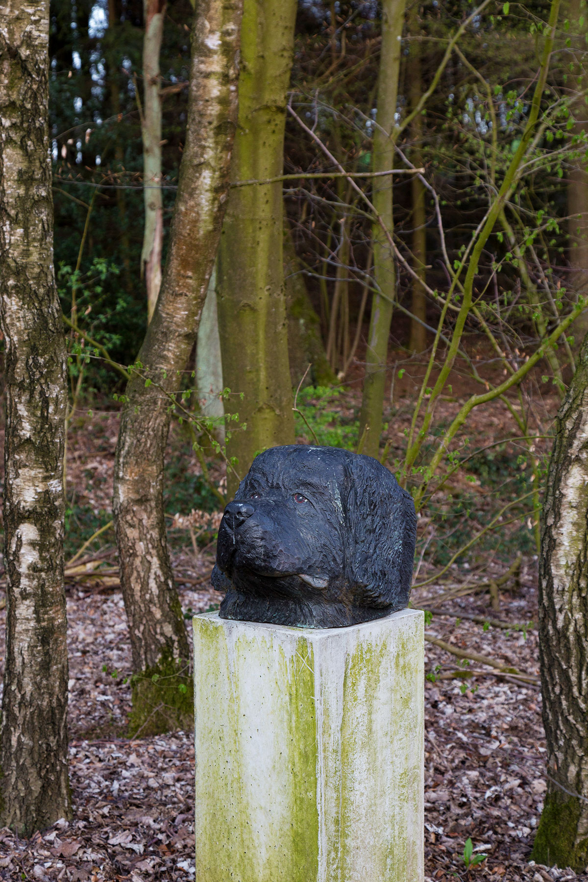 In seiner Ausrichtung danach, was die Natur an Ausblicken zu bieten hat, Bodenmodellierung und Anordnung der Pflanzen, den Raumstrukturen, gleicht das Tal einem Englischen Landschaftsgarten des 18. Jahrhunderts. Die Engländer sind große Hundeverehrer, auch hier gab es schon Hundegräber. Grab- und Denkmäler für Tiere entstanden, nachdem sich seit der ersten Hälfte des 18. Jahrhunderts zahlreiche Gartenbesitzer in ihren Garten- und Parkanlagen beisetzen ließen³, eine Verbindung, die weit zurück bis in die alten Hochkulturen reicht.⁴ Der junge Lord Byron ließ seinem Hund Boatswain 1808 im Gartendes Familienanwesens in Newstead Abbey (Nottinghamshire) ein Grabmonument mit Epitaph errichten.⁵ In Ludwigslust in Mecklenburg-Vorpommern gibt es ein repräsentativ gestaltetes Gartengrab für das verstorbene Lieblingspferd des Herzogs Friedrich Franz I. von Mecklenburg-Schwerin. Schon Friedrich II. von Preußen hatte beabsichtigt, sich auf der obersten Gartenterrasse von Schloss Sanssouci im Kreise seiner verstorbenen Hunde begraben zu lassen. Tiere, die für ihre Besitzer von emotionaler Bedeutung waren, wurden und werden mit eigenen Porträts und Biografien als Individuen charakterisiert und verehrt. Ein jüngeres Beispiel ist ein Hundegrab im Garten der Villa Wahnfried am Rande des Bayreuther Hofgartens: »Hier ruht und wacht Wagners Russ«, Richard Wagners Hund, übrigens auch ein Neufundländer. Der Bildhauer Ottmar Hörl hat ihn in seiner Arbeit Wagner’s Hund 1.000 Mal in Kunststoff gießen lassen. Ratibor bleibt einzigartig. Und er hat nicht nur ein literarisches und ein plastisches Denkmal erhalten, in der Skulptur von Frank Herzog nimmt er es locker mit einem ganzen Skulpturenpark auf.