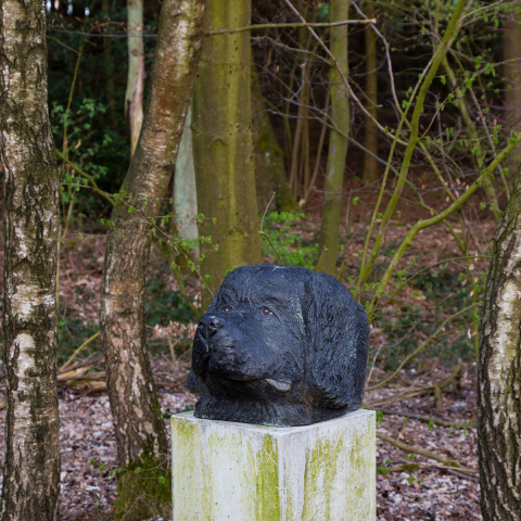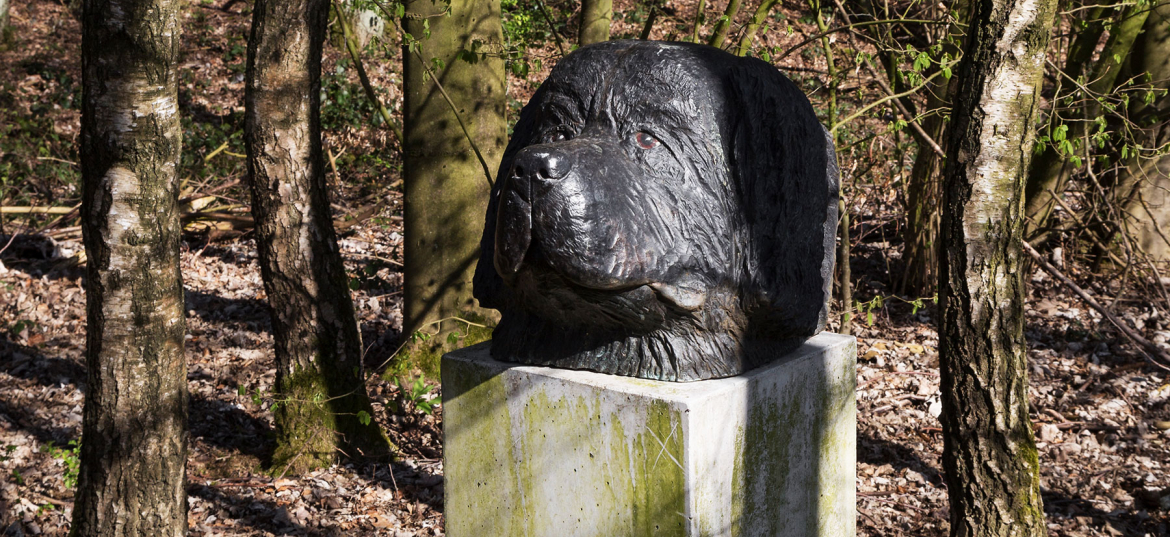 In seiner Ausrichtung danach, was die Natur an Ausblicken zu bieten hat, Bodenmodellierung und Anordnung der Pflanzen, den Raumstrukturen, gleicht das Tal einem Englischen Landschaftsgarten des 18. Jahrhunderts. Die Engländer sind große Hundeverehrer, auch hier gab es schon Hundegräber. Grab- und Denkmäler für Tiere entstanden, nachdem sich seit der ersten Hälfte des 18. Jahrhunderts zahlreiche Gartenbesitzer in ihren Garten- und Parkanlagen beisetzen ließen³, eine Verbindung, die weit zurück bis in die alten Hochkulturen reicht.⁴ Der junge Lord Byron ließ seinem Hund Boatswain 1808 im Gartendes Familienanwesens in Newstead Abbey (Nottinghamshire) ein Grabmonument mit Epitaph errichten.⁵ In Ludwigslust in Mecklenburg-Vorpommern gibt es ein repräsentativ gestaltetes Gartengrab für das verstorbene Lieblingspferd des Herzogs Friedrich Franz I. von Mecklenburg-Schwerin. Schon Friedrich II. von Preußen hatte beabsichtigt, sich auf der obersten Gartenterrasse von Schloss Sanssouci im Kreise seiner verstorbenen Hunde begraben zu lassen. Tiere, die für ihre Besitzer von emotionaler Bedeutung waren, wurden und werden mit eigenen Porträts und Biografien als Individuen charakterisiert und verehrt. Ein jüngeres Beispiel ist ein Hundegrab im Garten der Villa Wahnfried am Rande des Bayreuther Hofgartens: »Hier ruht und wacht Wagners Russ«, Richard Wagners Hund, übrigens auch ein Neufundländer. Der Bildhauer Ottmar Hörl hat ihn in seiner Arbeit Wagner’s Hund 1.000 Mal in Kunststoff gießen lassen. Ratibor bleibt einzigartig. Und er hat nicht nur ein literarisches und ein plastisches Denkmal erhalten, in der Skulptur von Frank Herzog nimmt er es locker mit einem ganzen Skulpturenpark auf.