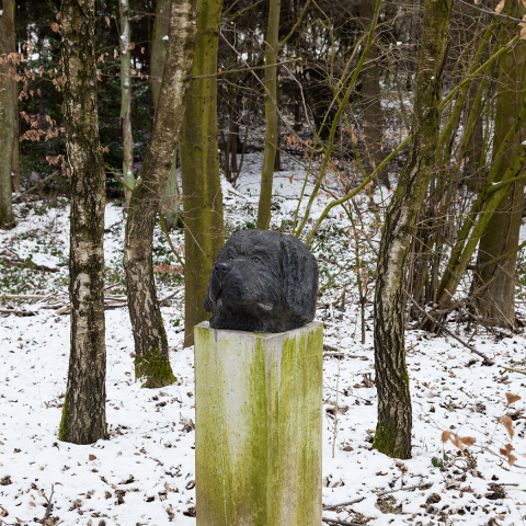 Frank Herzog bannt die Erinnerung an ein Tier, das es wirklich gab, das lieb gewonnene Wesen Ratibor. Kopf und Sockel bilden eine Einheit, erreichen eine Größe, die fast Menschenmaß hat, unterstreichen so die Bedeutung des Hundes für seine Besitzer. Der mächtige Kopf wirkt real und irreal zugleich, ähnlich dem großen und kleinen weißen Pferd von Johannes Brus auf der Höhe der Anlage ›im Tal‹. Auch die humorvollen Figuren von Fritz Schwegler Glockenfuß und Vasenkopf könnten sich aus ihrem Versteck im Wald, der Mihr zu Ratibor bewegen wollen. Diese erinnern mich an Frank Herzogs ›Vasenköpfe‹ in der Zusammenführung von Hund und Vase bei den erwähnten Fräulein-Vasen. Köpfe, die aus einer Vase auftauchen, können auch wieder darin verschwinden. Auch der Betrachter verschwindet wieder, er macht sich auf den Weg, verlässt den Verweilraum, den Gedenkort für Ratibor, und begibt sich zu Heinrich Brummacks Ort der Harmonie, der in ganz anderer Weise, in ›lauter Stille‹ zum Verweilen lädt. Hier erhascht er zwischen den Bäumen hindurch noch einmal einen Blick auf Ratibor.