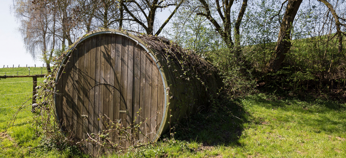 Der Verdacht, dass es hier irgendwann zu einem bewussten Eingriff menschlichen Gestaltungswillens gekommen ist, erhärtet sich, wenn man über die schmale Brücke geht und sich dem Silo nähert. Dann dechiffriert man die wilden Sträucher an der Plastikhülle als dornige Brombeersträucher, die zu beiden Seiten in regelmäßigen Abständen gepflanzt worden sind. Vielleicht, um den weniger schönen Anblick des Silos auf natürliche Weise zu verdecken oder auch, um das Leben in dem Fass hüllend zu umfangen, so wie Dornröschen im Märchen der Gebrüder Grimm in ihrem Schloss unter einem schützenden Dornengestrüpp in einen tausendjährigen Schlaf fällt.