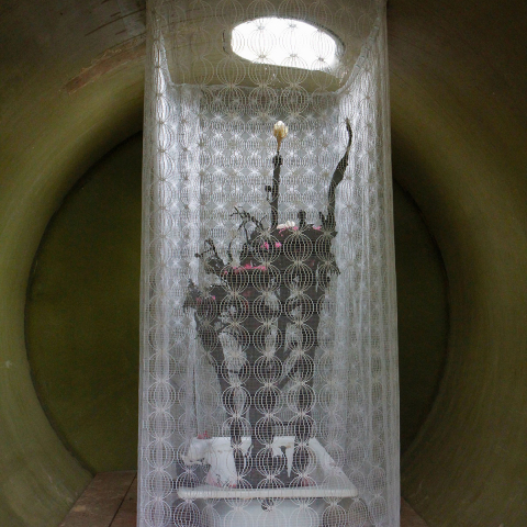 Innen und innerhalb des Vorhangs sieht man in der mit schwarzen Streifen und Teerklumpen verschmierten, teilweise davon bedeckten und damit ihrer ursprünglichen Aufgabe enthobenen Badewanne ein amorphes pflanzenähnliches pechschwarzes ›Etwas‹. An manchen Stellen reflektiert das tiefe Schwarz durch die einfallende Sonne das Licht. Wie Äste windet und streckt es sich nach oben. Mehr und mehr formt eine tropfende und triefende Teermasse ein fast undurchdringliches krusten- und netzartiges Geflecht. Zufällig entstandene Querstreben stabilisieren das fragile Objekt. Auf dem Weg nach unten bildet die zähe Teermasse an einigen ›Ästen‹ tropfenförmige Kokons aus. Wie auf Händen trägt die Baumkrone grelle pinkfarbene Blüten und erotisierende Knospen, die sich in unförmigen, ebenfalls mit Teer überzogenen, Blütenkelchen ähnlichen Schüsselchen, befinden. Und über allem ragt auf der korallenartigen Spitze eine goldfarbene Blüte: es ist die Krone des Lebens.