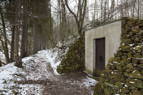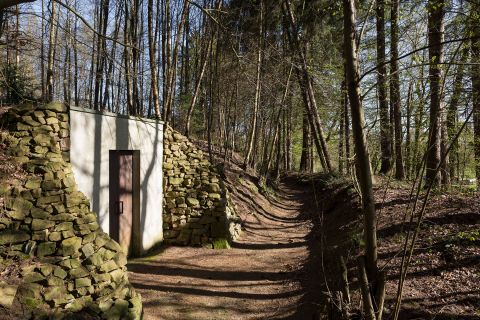 Der ›Einstieg‹ ins Gelände liegt wenige Meter zurück. Der Besucher folgt nun dem alten Mühlenpfad nach Norden, der tief gemuldet durch den Wald führt. Nach einigen Schritten trifft er rechter Hand auf einen in das felsige Gelände hineingetriebenen, fensterlosen Betonkubus, der durch eine Metalltüre zugänglich ist. Durch die geöffnete Tür blickt man in einen kleinen, dunklen Raum mit rot schimmernden Wänden. Ihn zu betreten, mag einige Überwindung kosten. Hat man die Türe hinter sich geschlossen, fällt lediglich durch schmale Schlitze rechts und links der Tür ein wenig Licht ein. Der rote Schimmer weicht der Dunkelheit. Die Augen sehen nicht mehr, dafür vernehmen die Ohren rhythmisch wiederkehrende Töne: eine Herzfrequenz mit 60 Schlägen in der Minute.