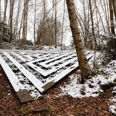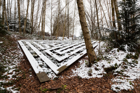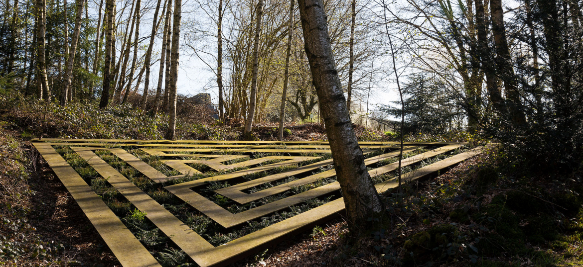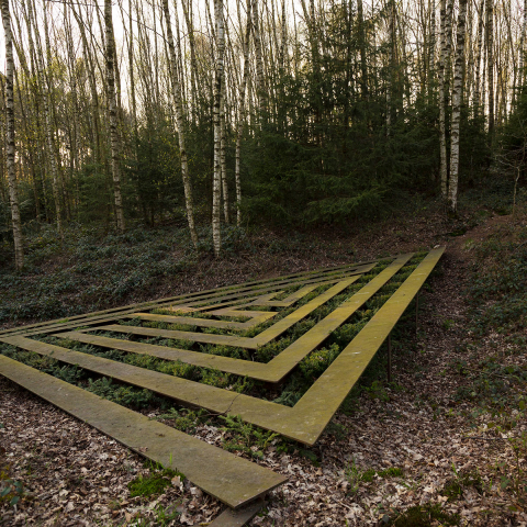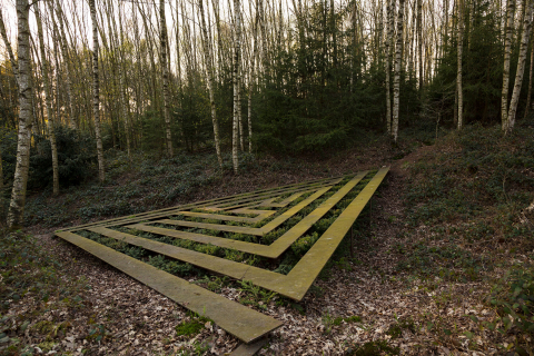 Am Rand des Wortelkampschen Geländes in der Nähe des kleinen Friedhofs wächst ein junger Wald. In diese aufstrebende Vegetation aus allerlei Hölzern, Gestrüpp und Hecken wird das Labyrinth gebaut. Es ist die Grundrissfigur eines gleichseitigen Dreiecks, in welches die labyrinthischen Wege eingezeichnet sind. ›Wände‹ und ›Wege‹ dieses Labyrinths sind zwar im Material unterschieden, bilden aber mit ihrer Oberfläche eine Ebene. Eine stählerne Konstruktion aus T-Trägern (Breite = 30 cm) formt ein dichtes Wegenetz und überspannt eine flache Senke. Aus der Senke wuchert das Grün in die Zwischenräume (Breite = 30 cm) der Wege. Alljährlich werden die Pflanzen auf die Ebene der Wege gestutzt. So entsteht ein reliefartiges Bild aus Vegetation und Bauwerk. Ringsumher wächst der Wald in die Höhe und umschließt das Bild des Labyrinths wie einen lichtungsähnlichen Raum. Die Architektur des Labyrinths im ›Tal‹ erinnert an die Idee des Dädalus und variiert das Bild des Rätselhaften, Symbolhaften. Im Unterschied zum klassischen Labyrinth mit nur einem Zugang und einem Zentrum oder dem Irrgarten mit Wegekreuzungen und Irrwegen hat das Labyrinth im ›Tal‹ drei Zugänge. In seinem Zentrum kann man umkehren oder zwischen zwei Möglichkeiten wählen, den Weg fortzusetzen.