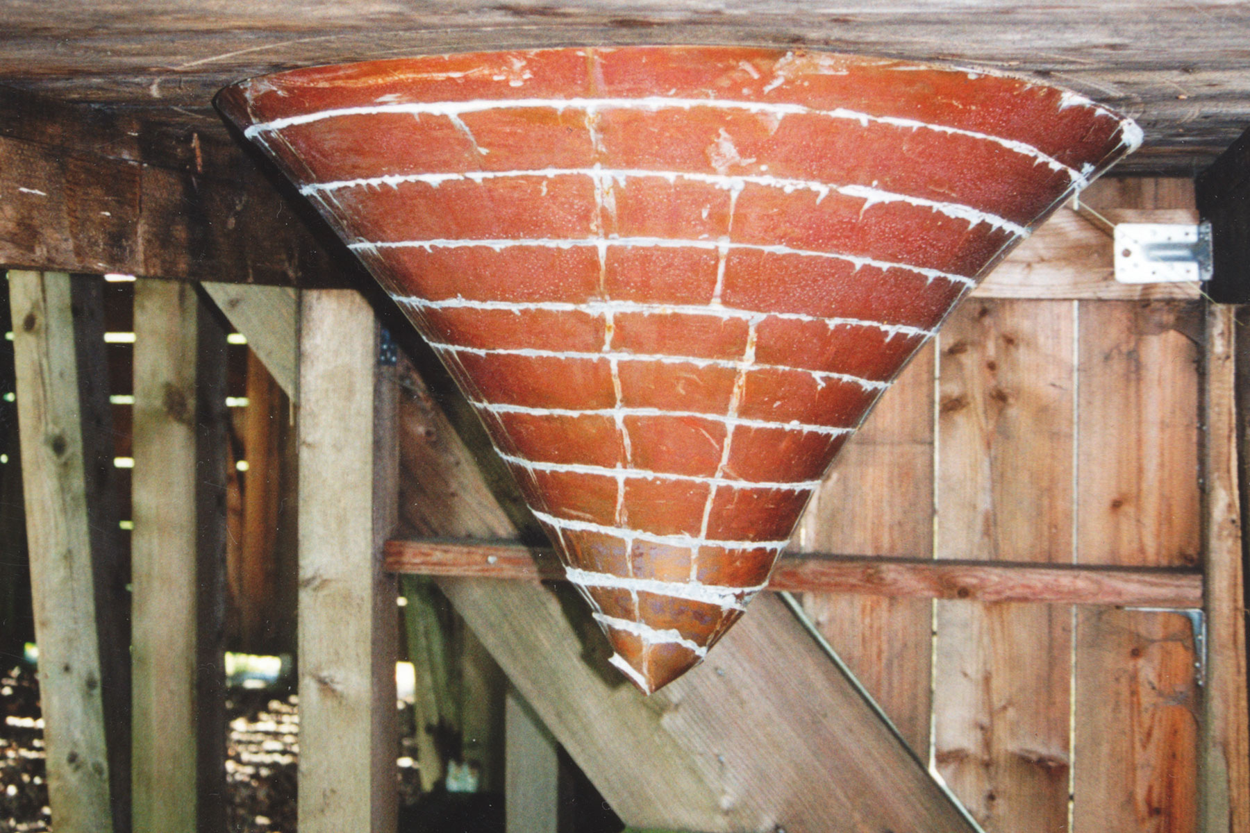 Jan Levens Arbeit ist die einzige im Tal, die in einer anderen platziert ist und sich gleichzeitig in deren Schutz verborgen hält. Sie zählt damit zu den zu rückgezogensten und stillsten im gesamten Gelände. Selbst wenn man um ihre Existenz weiß, begegnet man ihr erst auf den zweiten Blick im Halbdunkel in einer Nische unterhalb der treppenförmigen Holzkonstruktion, so daß ihr der Charakter des ›Sich-Nicht-Zeigen-Müssens‹ geradezu wesenseigen ist. Als ein kopfüber hängender Schneckenkegel, dessen patinierte rötliche Kupferhülle eine nahezu perfekte Mimikry mit ihrer Umgebung erzeugt, könnte man Levens organisches Objekt zunächst für eine Laune der Natur halten. Ein ambivalenter Eindruck von Behaustheit und Abgestorbensein, Verschlossenheit und ›Sich-Öffnen-Könnens‹ geht von ihm aus. Feuchtigkeit hat mit der Zeit die Zwischen räume des spiralförmig gewundenen Metalls in eine helle Kalkfuge verwandelt, die sich mit den durchscheinenden Licht schlitzen des Bretterverschlags optisch in Beziehung setzt. Für die Form des Schneckenkegels existieren grundsätzlich nur zwei Möglichkeiten seiner Verortung: das Hinstellen auf den Boden oder Aufhängen an Wand oder Decke. Leven hat sich für Letzteres entschieden, mit der Folge, daß das Objekt mit seiner ›Behausung‹ aufs Engste verbunden ist. Um Levens Schneckenkegel als Ganzen zu betrachten, muß man sich wie ein Natur- oder Höhlenforscher in gebückte Position begeben und über Stützbalken hinweg unter die ›Seitenschiffe‹ von Burys Gehäuse klettern. Möglich, daß die (in der Geschichte der Skulptur ungewöhnliche) ›Deckengebundenheit‹ des Objekts seine Anbringung in einer unteren Nische des treppenförmigen Baus erfordert, um den Charakter eines Ausstattungsgegenstands zu vermeiden. Vielmehr wird hier, wo Skulptur und Betrachter ihren Raum für sich haben, auch ein intimerer Dialog möglich.