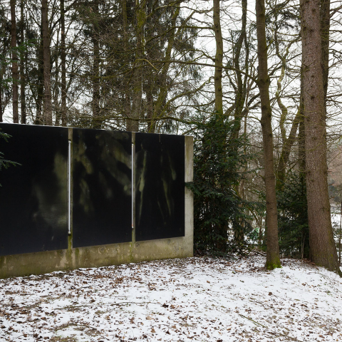 Für ihre bislang einzige Arbeit im Außenraum hat Krimhild Becker einen kongenialen Ort gewählt. Eine Lichtung im Waldstück, die den Blick frei gibt auf den angrenzenden Friedhof. Es ist ein Ort des Innehaltens und Verweilens, des Sinnierens und des Ahnens. Gleichzeitig handelt es sich um einen denkbar unprätentiösen Ort, der nicht durch eine exponierte Aussichtslage auf sich aufmerksam macht, sondern eher still und am Rande entdeckt werden will. Krimhild Becker hat ihr Photo-Triptychon auf dem Scheitel zwischen schützenden Baumreihen und dem weitläufigen Gräberfeld platziert, zwischen aufwärtsstrebenden Baumspitzen und sich in die Tiefe der Landschaft ausdehnender Weite, zwischen hell und dunkel, offen und geschlossen.