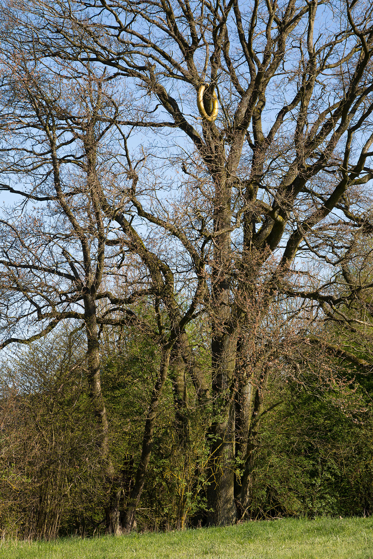 Der goldene Ring schmückt die Eiche und hebt sie damit aus der Vielzahl der Bäume im ›Tal‹ hervor. Ich bemerke, daß es sich um ein besonders schönes Exemplar handelt, das seine Äste kraftvoll nach außen streckt. Doch schon im nächsten Moment vermag der Vorgang des Heraushebens dieser bestimmten Eiche, die Augen für die Spezies als Ganzes zu öffnen: ins Bewußtsein gerückt werden Vitalität und Dauer der in ›Jahresringen‹ wachsenden Art, die als im Doppelsinne ›überragende‹ pflanzliche Lebensform Landschaften prägt. Bäume vermitteln zwischen Himmel und Erde. Durch die der Arbeit eigenen Blickführung hoch in eine von Himmel umfangene Baumkrone, findet diese Beziehung ihr Bild. Der in seinem Maßstab auf die Größe des Baums abgestimmte Ring suggeriert seine Zugehörigkeit, die in der realen Erfahrungswelt jedoch keine Entsprechung findet. Durch ihr ungeahntes Zusammenspiel fühlt man sich dem Ursprung von Poesie nahe, verstanden als Hervorbringen und Geschehnis und nicht als pures Machen.