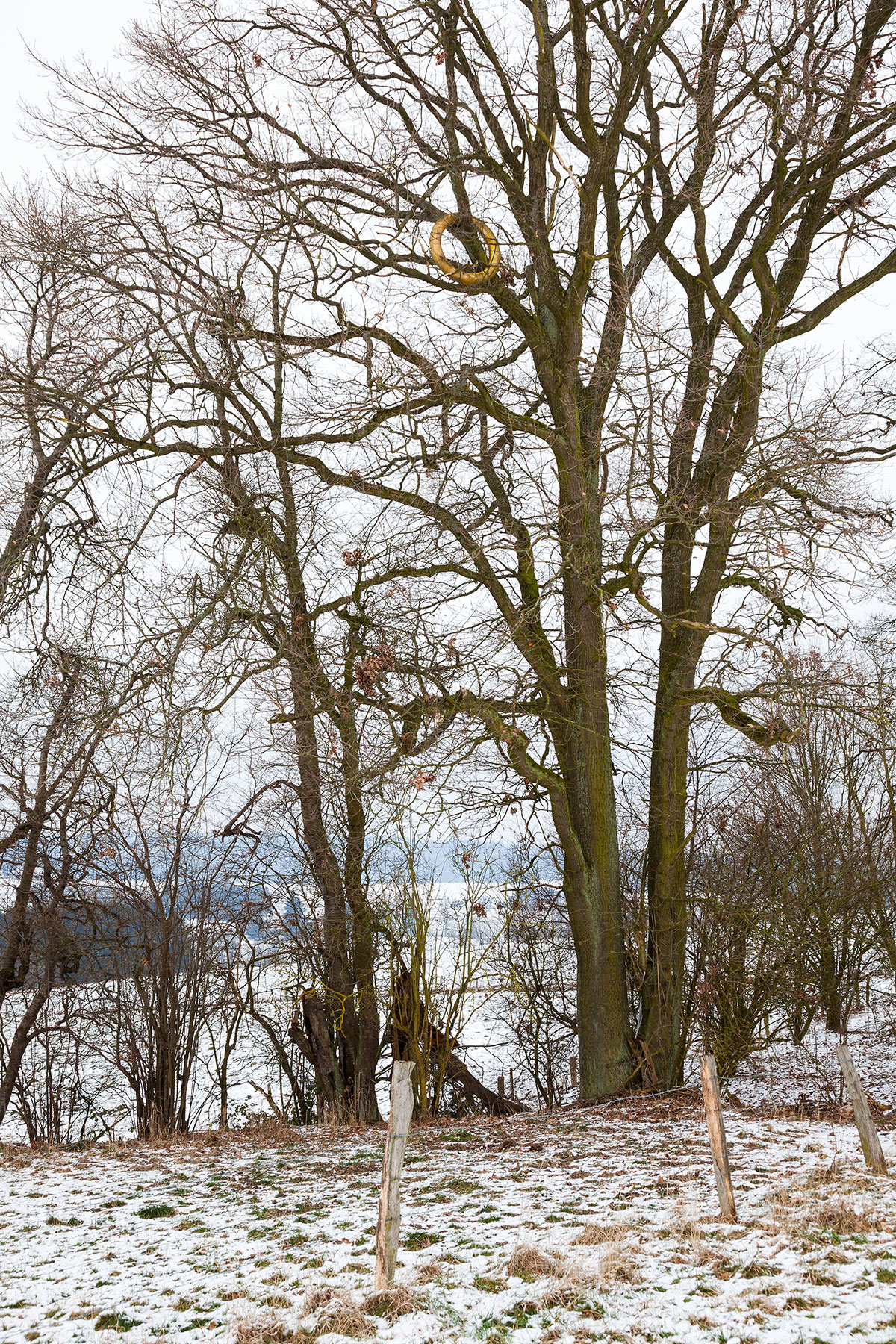 In unserem Kulturkreis steht der goldene Ring als Zeichen eines geschlossenen Bündnisses. Es stellt sich die Frage, was für ein Bündnis und wer es mit dem Baum eingegangen sei. Ich lese nach und stoße darauf, daß im Mittelalter bei der Übereignung von Grundstücken ein goldener Ring übergeben wurde. Der Besitzer des Rings war dann auch rechtmäßiger Eigentümer des Grundstücks, und man möchte hinzufügen der darauf stehenden Bäume. In dieser Hinsicht scheint das Eigentum an den Baum zurückgegeben. Man könnte es als Hinweis darauf nehmen, daß Bäume immer auch sich selbst gehören. Der Ring ohne Anfang und Ende symbolisiert Zeit und ihren Kreislauf in Jahreszeiten. Ich stelle mir den Ring im Winter vor. Nun hängt er weithin sichtbar im kahlen Geäst, dabei nicht minder geheimnisvoll. Man kann in diesem Ring eine raum-zeitliche Zentrierung des ›Tals‹ erblicken.