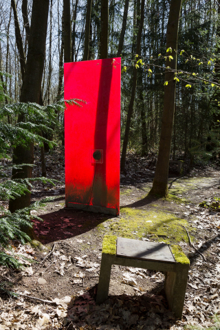 Aber hier, im Wald, wo ist das Außen und wo das Innen? Diese Scheibe besteht aus zwei dünnen Gläsern; zwischen beide wurden zwei rote und eine weiße Folie geklebt, so daß das Glas rot und opak wirkt. Das Glas ist nicht mehr durchsichtig, es bekommt ein Inneres, die Scheibe – trotz ihrer nur 1,2 cm Tiefe – wird Körper, ein roter, gläserner Körper. Aber ein Körper hier im Wald? Ein Körper, der keine Skulptur ist, der kein Objekt im herkömmlichen Sinne ist und sich – deswegen – von vielen Arbeiten im Tal unterscheidet. Die Maße dieses Körpers sind nicht überwältigend (knapp 2 Meter hoch) und die Glasscheibe wirkt anmutig leicht und trotz ihres Rots, fast schutzlos. An beide Seiten dieses Körpers, vorne und hinten, sind auf 90 cm Höhe zwei Schallwandler symmetrisch angebaut. Sie wirken wie ein Organ, ein Auge, ein Ohr oder ist es das Innere?, ein geöffneter Mund? Glas ist hart, zerbrechlich, Glas kann farbig wirken und Stimmen übertragen, Glas kann wie der Spiegel, für einen kurzen Augenblick die Welt in sich einfangen; Glas kann aber auch verletzen, Glas ist dann Kante und Messer, Schärfe und Lanze, Grenze und Wunde.
