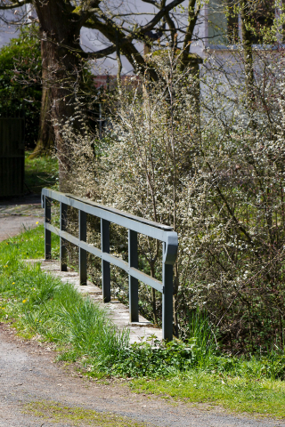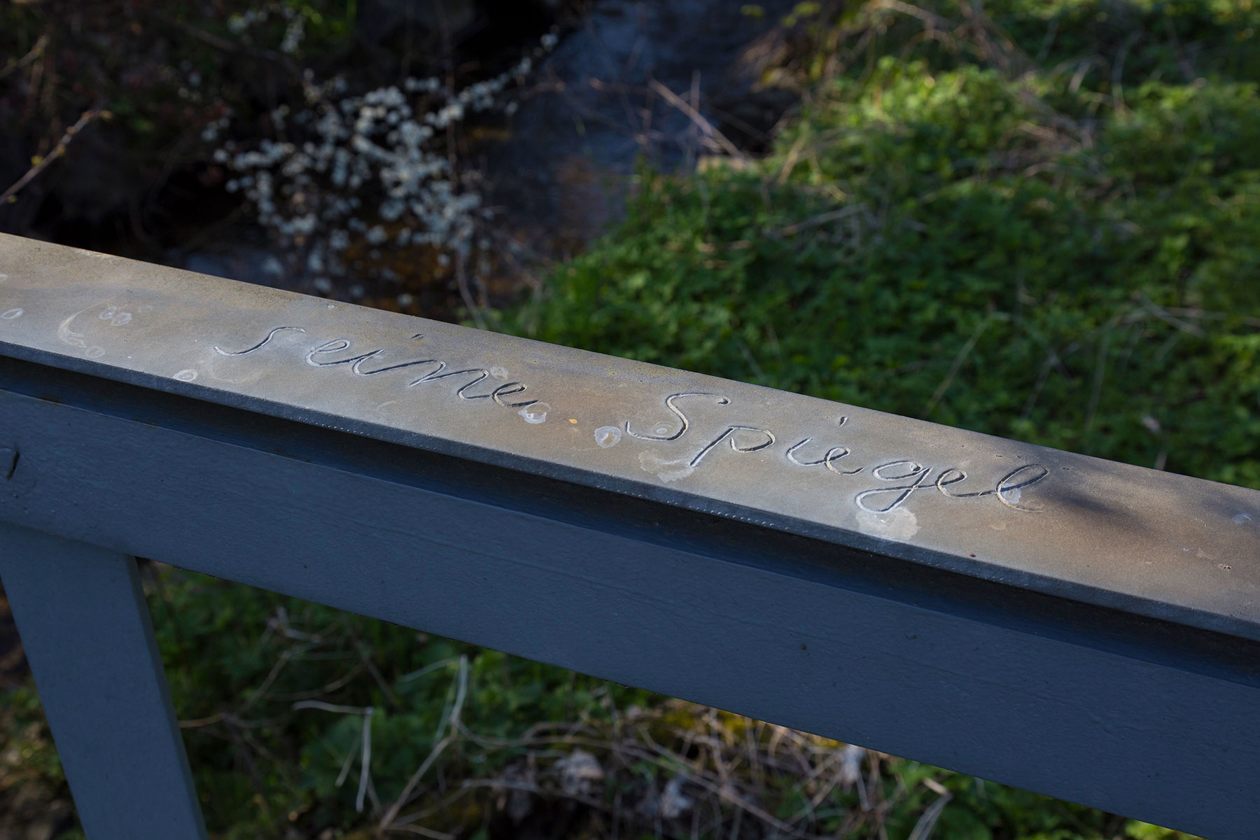 Nicht anders verhält es sich mit seiner zweiten Arbeit im ›Tal‹. Nahe des Hauses von Erwin und Ulla Wortelkamp führt eine Brücke über einen Bach. Sie liegt in einer Kurve. Ein Geländer grenzt sie nach den Seiten ab. Zumeist sind es Autofahrer, die die Brücke queren. Für sie ist es praktisch unmöglich, die Arbeit Paul Isenraths zu sehen, geschweige denn wahrzunehmen. Denn die Arbeit ist ein aufgesetzter Handlauf an dem Geländer. Leicht nur hebt er sich ab von der vorfabrizierten Höhe, bildet lediglich einen kleinen Spalt fürs Licht, schwebt gleichsam über dem Geländer. Ein bloßes Stahlband – wäre da nicht am Ende ein kleines Becken in den Stahl getrieben, in dem sich Regen- und Tauwasser sammelt; ein bloßes Stahlband mit kleinem Wasserbeckchen – mündete ins Wasser nicht ein Worteband, mündeten nicht die folgenden Worte in den Spiegel, die Isenrath zu einem Satz gebaut ins Stahlband geformt hat: Gewicht | Balance | Lage | zerfließen zum Sammeln | nachgebend | scheinbar ohne Form | formen seine Spiegel die Kräfte