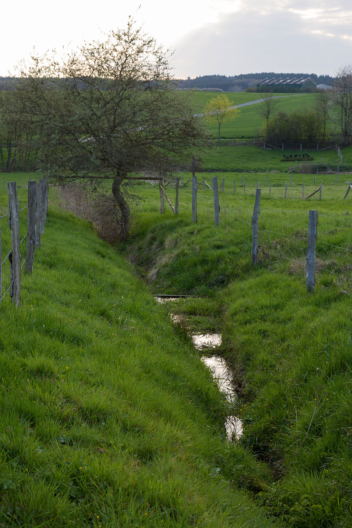 Man hat sich gerade daran gewöhnt, den Blick nicht nur, auf Naturschönheit konditioniert, über Weiden und Auen schweifen zu lassen, sondern auch darauf eingestellt, Knicke in Zaun und Schneisen, vertikale Marken und Gerätschaften als Kunst in der Natur zu akzeptieren, da nimmt man, vielleicht durstig des Sommers, einen Wasserspiegel wahr. Eine Pfütze wahr – aber eine in Dreiecksform, gleichschenklig scheinend und auch noch tetraederhaft dreidimensional und stahlgewandet? Wasser fließt über den spitzen Winkel des Dreiecks, Wasser eines Rinnsals von der Weide. Die Basisfront des Dreiecks dient gleich einem kleinen Staudamm dem Halten des Wassers. In einer Ackerfurche befindet sich das Ganze. Die drei Seiten des Dreiecks liegen – wie könnte es anders sein? – in einer waagerechten Ebene. Es sind die Sichtkanten der in die Erde eingelassenen Stahlbleche. Wir stehen vor einem horizontalen Moment in der Hügellandschaft des Westerwaldes.
