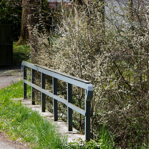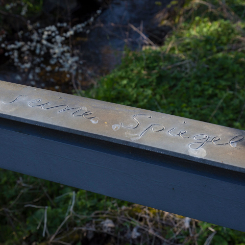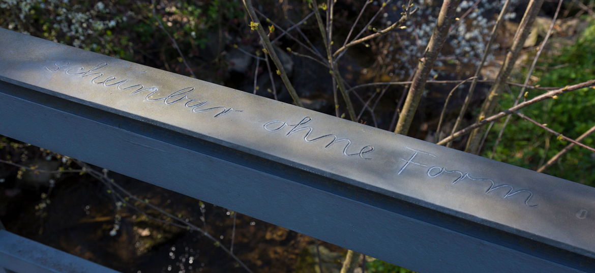 Nicht anders verhält es sich mit seiner zweiten Arbeit im ›Tal‹. Nahe des Hauses von Erwin und Ulla Wortelkamp führt eine Brücke über einen Bach. Sie liegt in einer Kurve. Ein Geländer grenzt sie nach den Seiten ab. Zumeist sind es Autofahrer, die die Brücke queren. Für sie ist es praktisch unmöglich, die Arbeit Paul Isenraths zu sehen, geschweige denn wahrzunehmen. Denn die Arbeit ist ein aufgesetzter Handlauf an dem Geländer. Leicht nur hebt er sich ab von der vorfabrizierten Höhe, bildet lediglich einen kleinen Spalt fürs Licht, schwebt gleichsam über dem Geländer. Ein bloßes Stahlband – wäre da nicht am Ende ein kleines Becken in den Stahl getrieben, in dem sich Regen- und Tauwasser sammelt; ein bloßes Stahlband mit kleinem Wasserbeckchen – mündete ins Wasser nicht ein Worteband, mündeten nicht die folgenden Worte in den Spiegel, die Isenrath zu einem Satz gebaut ins Stahlband geformt hat: Gewicht | Balance | Lage | zerfließen zum Sammeln | nachgebend | scheinbar ohne Form | formen seine Spiegel die Kräfte Beide Arbeiten von Paul Isenrath spielen mit der Flüchtigkeit, die dem Menschen eignet, wenn er spazieren, wenn er zur Entspannung in die Natur hinaus geht. Dieser Flüchtigkeit kann man etwas entgegensetzen, indem man die Aufmerksamkeit erfordert, sie erzwingt. Man kann die Aufmerksamkeit aber auch hinter der Flüchtigkeit als ein nur Verborgenes voraussetzen und ›nur‹ darauf hoffen, sie zu erregen. Letzteres tut Paul Isenrath. Ja, er erhebt dies sogar zum Kunstprinzip. Er holt den Betrachter, den Spaziergänger und Wanderer da ab, wo dieser mit offenem Auge verloren plötzlich sieht, wo dieser aus seiner Flüchtigkeit gerissen angehalten wird aufzumerken, wahrzunehmen, zu sinnieren.