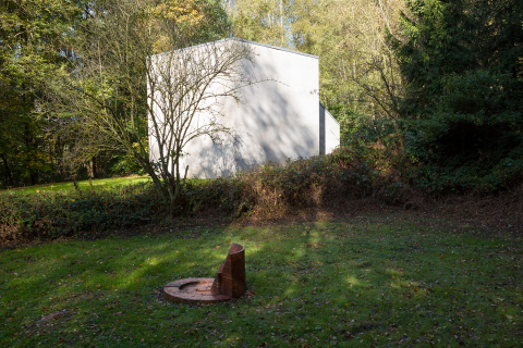 Passiert man die zum ›Tal‹ gelegene Wand des Sander-Hauses, taucht linker Hand ein kleines Bildwerk aus rötlichem Ton auf. Es lenkt den Blick ab vom gerade geführten Weg auf eine Gras bewachsene Senke, in deren Mitte das Gebilde liegt. In der Verfolgung des Wegs umschreitet man das Bildwerk, sieht aus der Entfernung auf es hinab. Es entzieht sich in seiner geringen Größe einer Annäherung, baut eine Distanz auf, die beim Herantreten gewahrt bleibt.