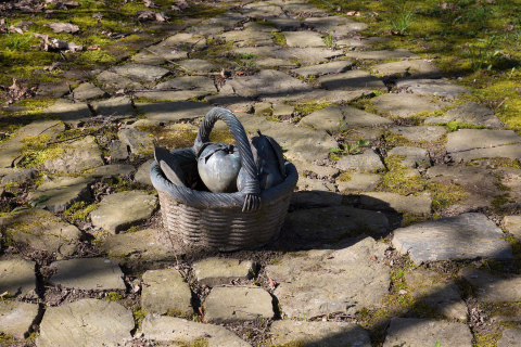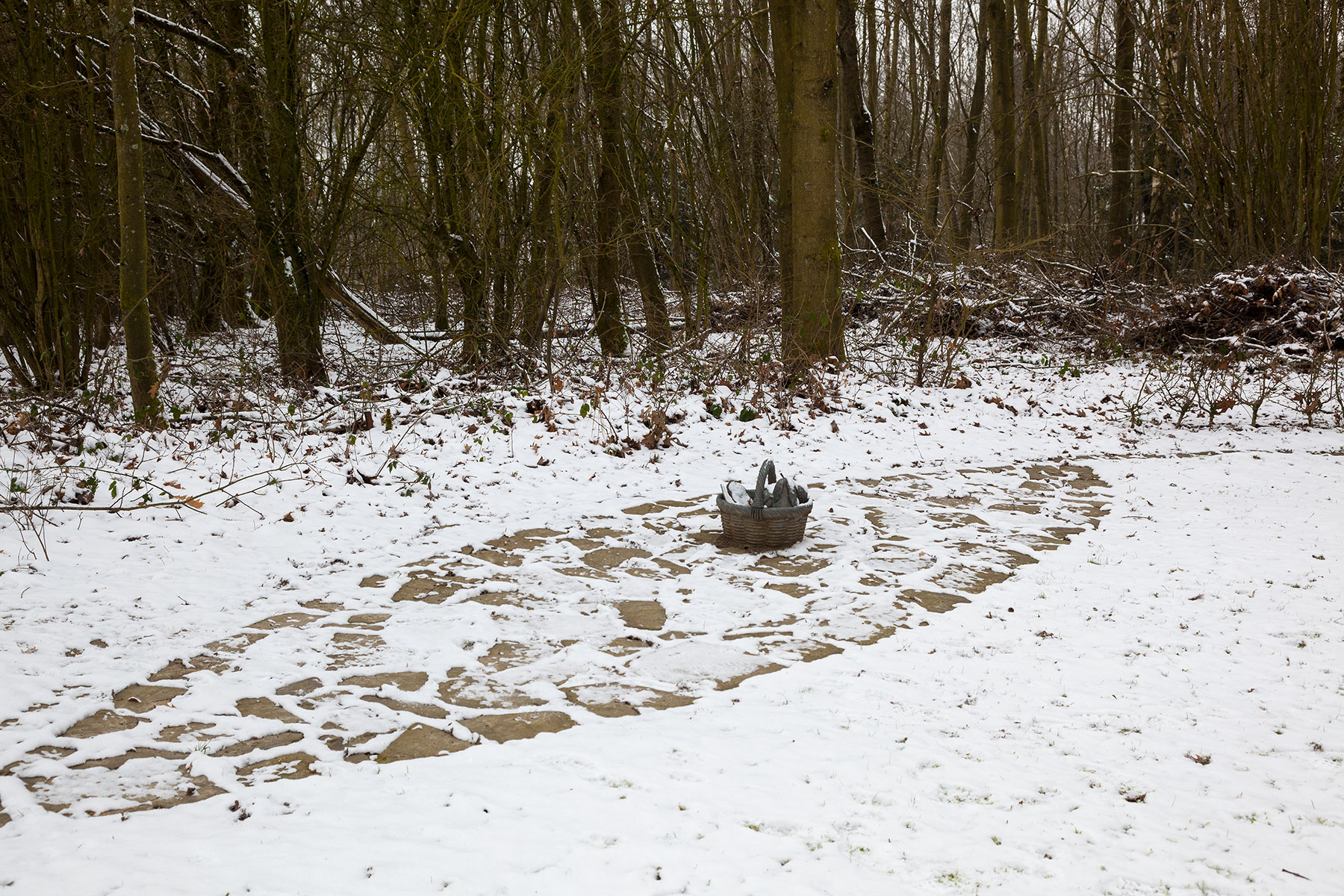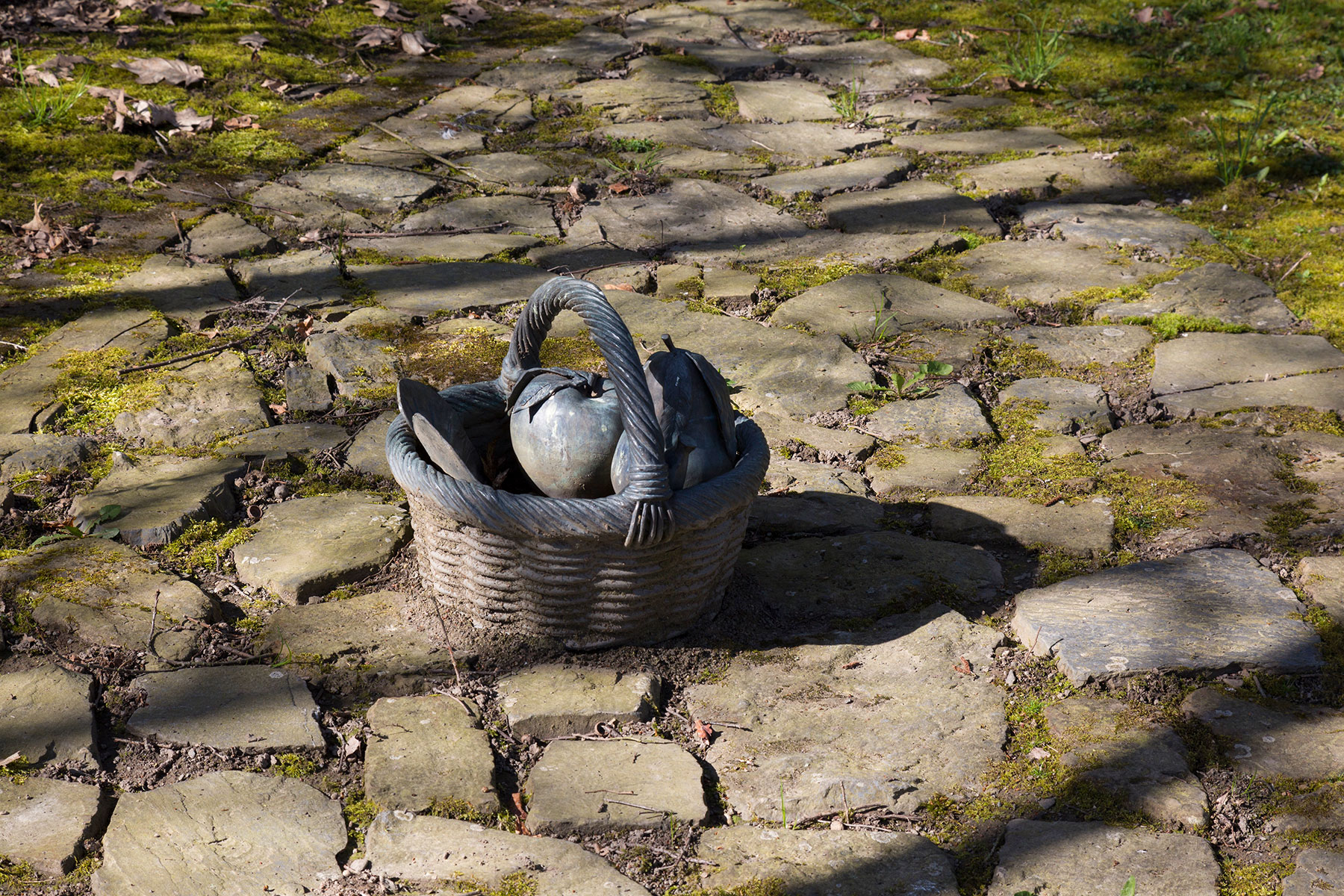 Den Betrachter abermals einen anderen Standpunkt einnehmen lassend, steht auf der gegenüberliegenden Seite des Weges, der den ansonsten mit Natursteinen bepflasterten Platz kreuzt, ein bronzener Korb voller Früchte und Blätter aus Bronze – wie zufällig abgestellt, vergessen. Ein industriell gefertigtes, die Natur nachahmendes Stilleben, das Lebendiges einfriert. Es ist ein Bild, das über die Imitation von Realität berichtet. Als solches verweist es nicht nur auf die durch Handeln erwirkte Normalität und Autonomie der Dingwelt, sondern darüber hinaus auf die Tatsache, daß Naturprozesse jeglicher Art – von der Pflanze bis zum Menschen – bereits technisch reproduzierbar sind. Daß vor diesem sich bewußt zu machenden Hintergrund ein zeitgemäßes, direktes Gespräch zwischen Mensch und Natur aufgenommen werden kann, schließt Wolfgang Luy nicht aus. Vielmehr fordert er etwas heraus, das, mit seelischer Erlebensqualität umschrieben, die Begegnung mit Natur wie mit Kunst für den Menschen beherbergen kann. Dieses Etwas geht über Sentimentalität und touristischen Erholungswert von Landschaft ebenso weit hinaus, wie über ein ästhetisches Vergnügen. Entwickeln kann es sich allerdings erst aus einem reflektierten Mit- und nicht aus einem Gegeneinander.